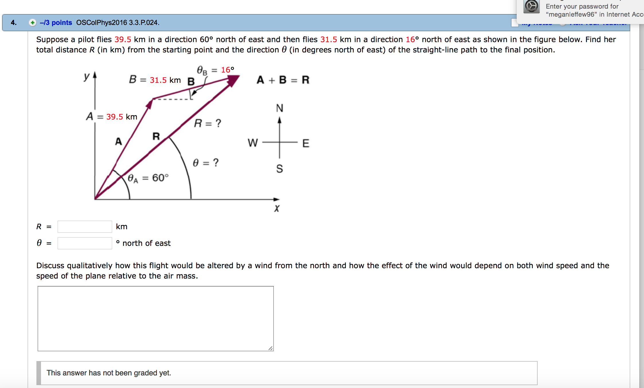 “meganleffew96” in Internet ACCi Suppose a pilot flies 39.5 km in a direction 60° north of east and then flies 31.5 km in a direction 16° north of east as shown in the figure below. Find her