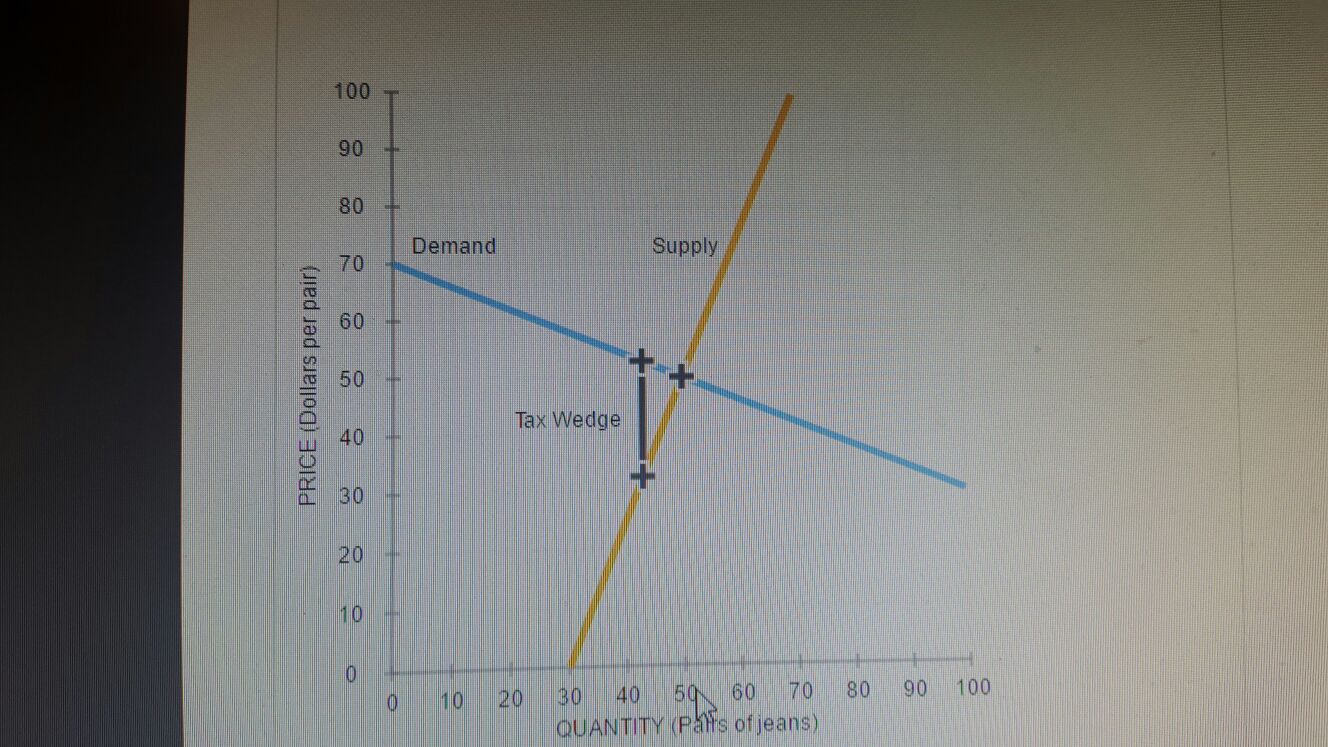 The following graph shows the daily market for jeans. Suppose the government institutes a tax of $20.30 per pair. This places a wedge between the price buyers pay and the price sellers receive.