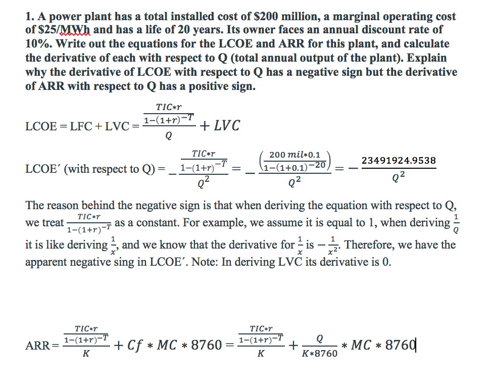 apparent negativex sing in LCOE'. Note: In deriving LVC its derivative 1s 0. TIC*T TIC‘T _ 1—(1+r)—T = 1—(1+r)—T Q