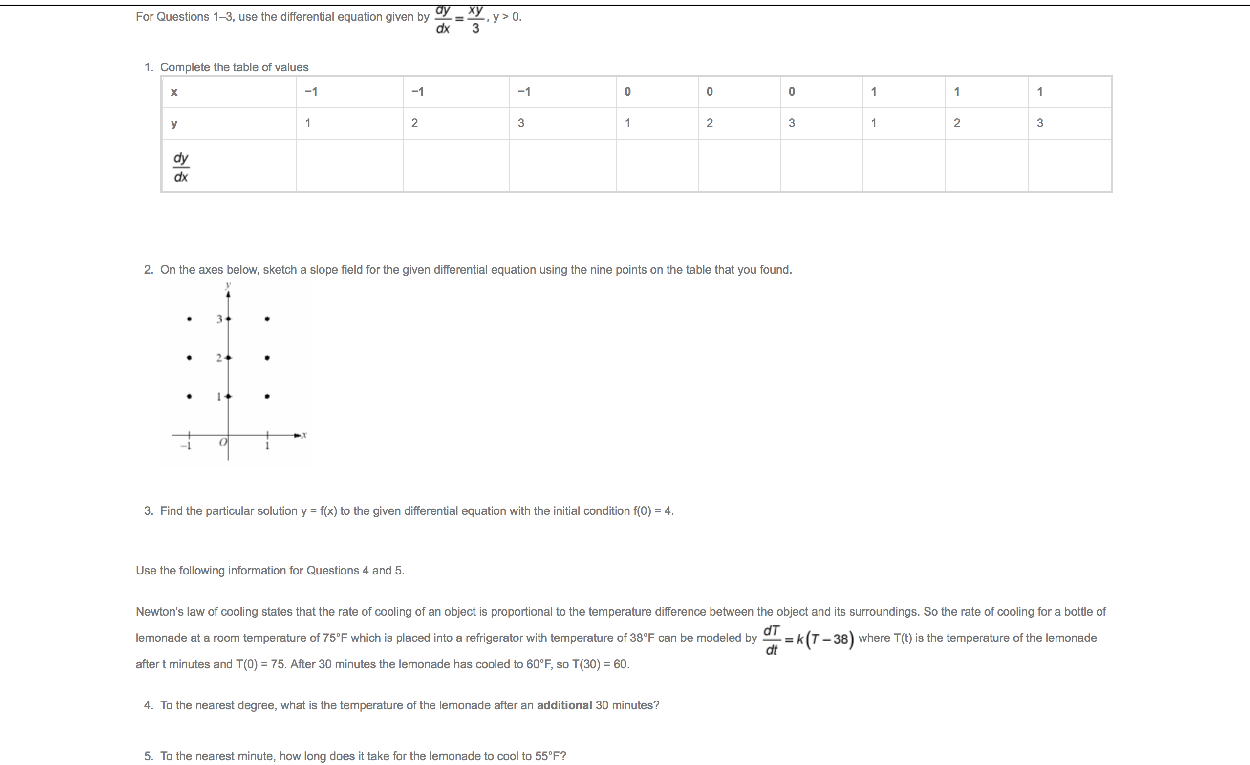 o | e 3. Find the particular solution y = f(x) to the given differential equation with the initial condition f(0) = 4. Use the following information for Questions 4 and 5. Newton's law of cooling states that the rate of cooling of an object is proportional to the temperature difierenoe between the object and its surroundings. So the rate of cooling for a bottle of UT lemonade at a room temperature of 75°F which is placed into a refrigerator with temperature of 38°F can be modeled by E = k(T_ 38) where T(t) is the temperature of the lemonade aftert minutes and T(0) = 75. After 30 minutes the lemonade has cooled to 60°F, so T(30) = 60. 4. To the nearest degree, what is the temperature of the lemonade after an additional 30 minutes? 5. To the nearest minute. how long does it take for the lemonade to cool to 55°F?