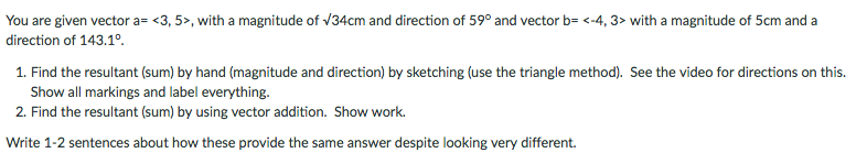 2. Find the resultant [sumil bv using vector addition. Show work. Write 1-2 sentences about how these provide the same answer despite looking verv different