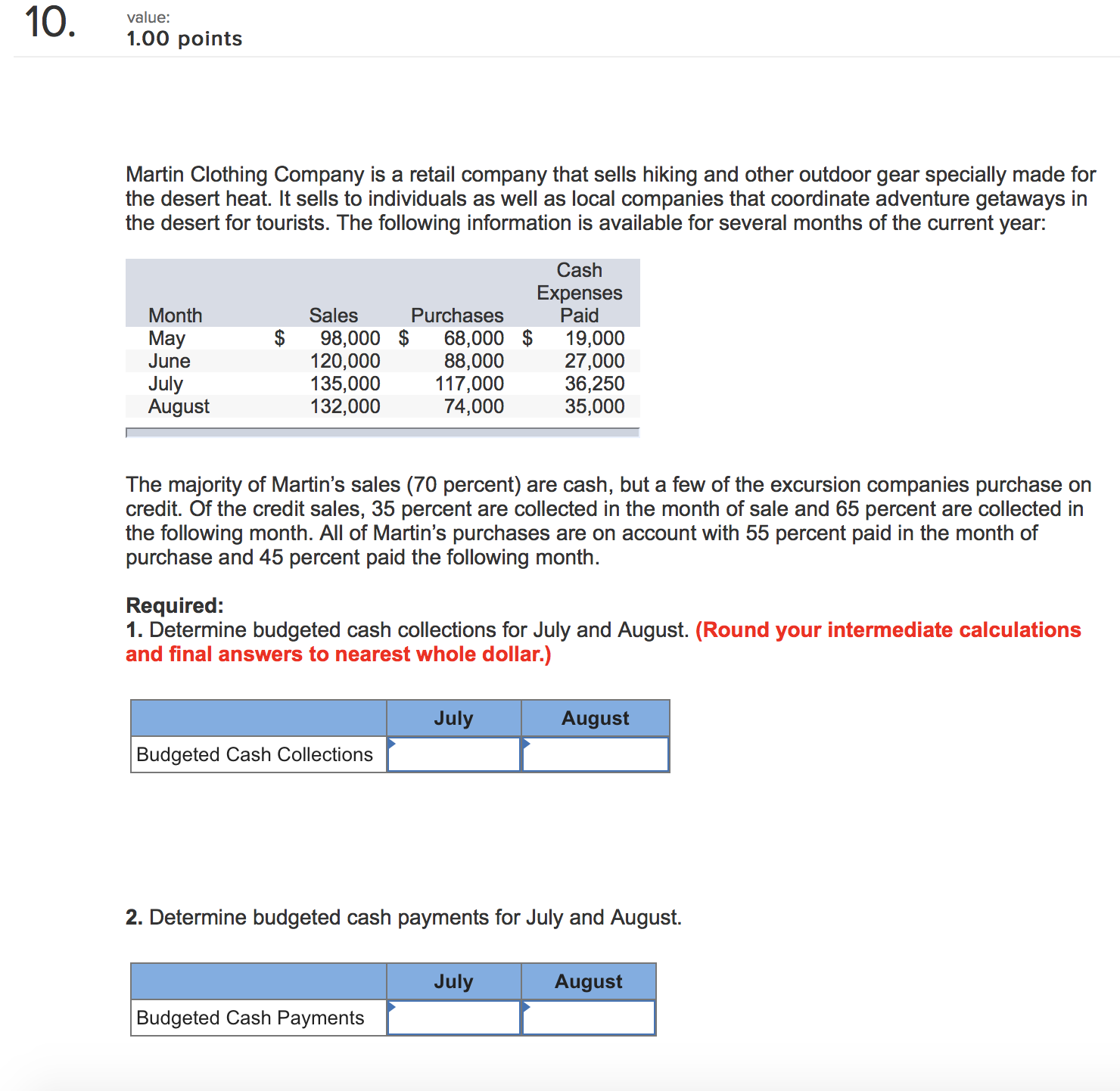 1. Determine budgeted cash collections for July and August. (Round your intermediate calculations