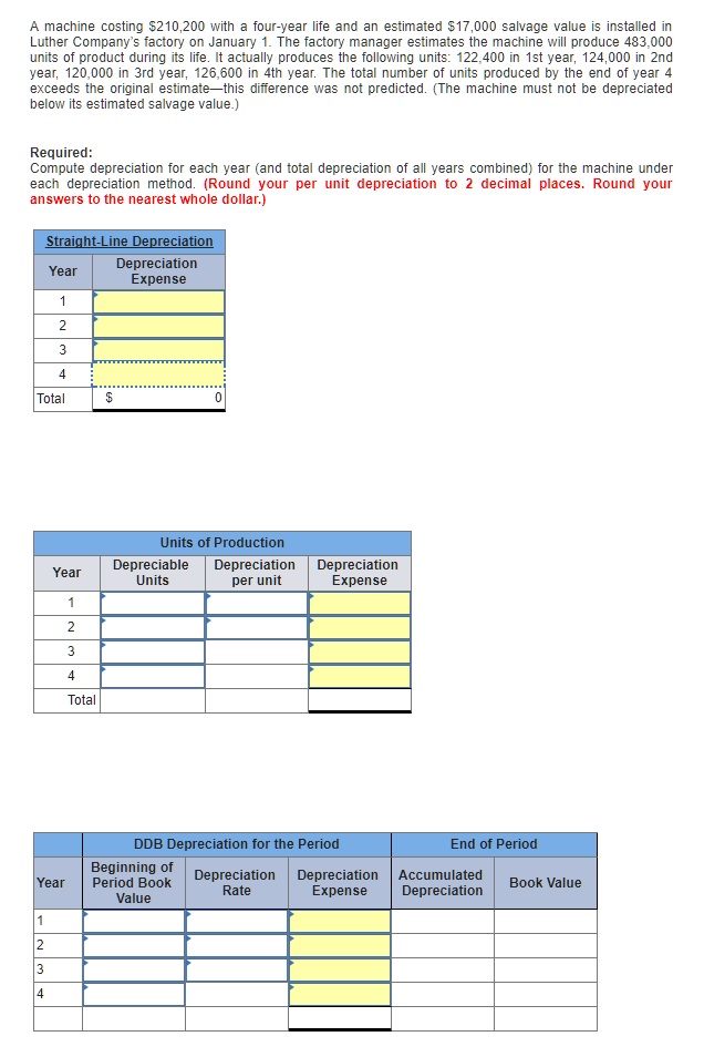 A machine costing $210,200 with a four-year life and an estimated $17,000 salvage value is installed in Luther Company’s factory on January 1. The factory manager estimates the machine will produce 483,000 units of product during its life. It actually produces the following units: 122,400 in 1st year, 124,000 in 2nd year, 120,000 in 3rd year, 126,600 in 4th year. The total number of units produced by the end of year 4 exceeds the original estimate—this difference was not predicted. (The machine must not be depreciated below its estimated salvage value.)