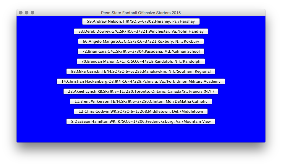 Below is a sketch of what ot should look like (the final application may vary, but it should have one panel with 11 buttons with information from the collegeFootballPlayer objects).