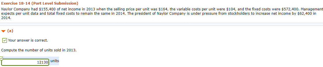 Exercise 18-14 (Part Level Submission) Naylor Company had $155,400 of net income in 2013 when the selling price per unit was $164, the variable costs per unit were $104, and the fixed costs were $512,400. Management