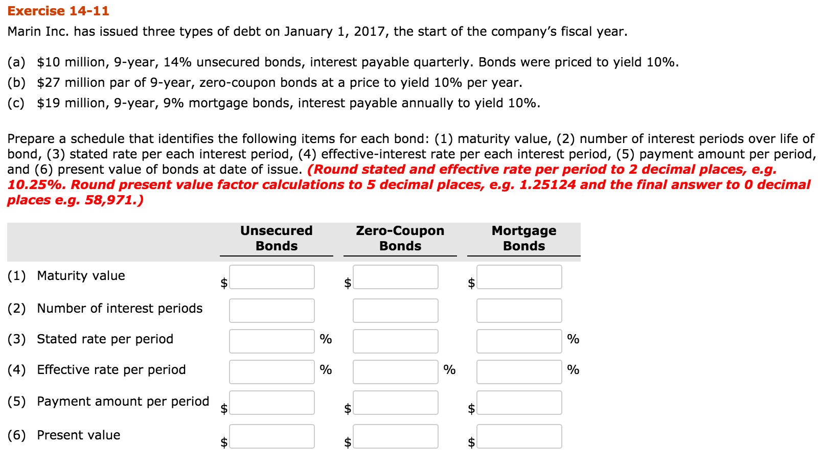 Marin Inc. has issued three types of debt on January 1, 2017, the start of the company’s fiscal year. (a) $10 million, 9—year, 14% unsecured bonds, interest payable quarterly. Bonds were priced to yield 10%.