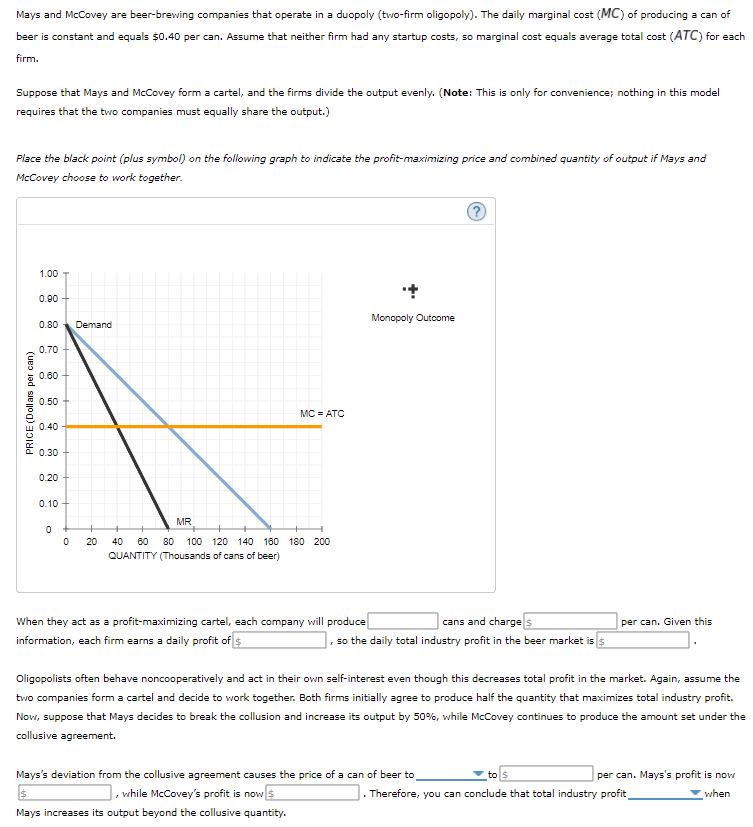 mouires that the two companifi must equally share the output.) Place the black point {plus symbol) on the Following graph to indicate the pmfibnlaximizfng price and Worried quantity ofou'l'put iF Mays and