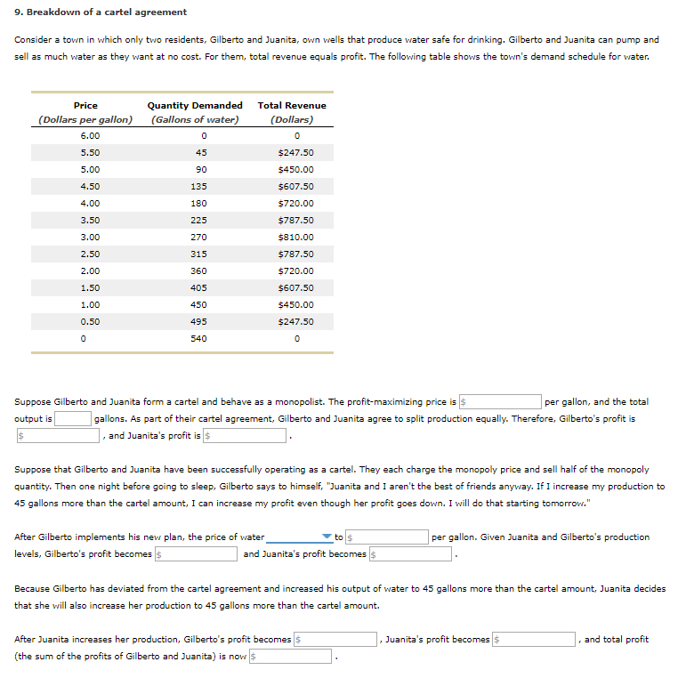 9. Breakdown of a cartel agreement Consider a town in which onlyr two raidenisr Gilberto and Jua nilslr own wells that pmd uce water safe for drinking. Gilberto and Juanita can purrq: and