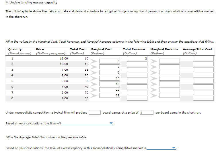 4h Understanding excess capacity The following iable shin-rs the daily cost data and demand schedule For a typical firrn producing boa rd QEIITIE in a rnnnppcllisiically ccirrqnetitiye marloet in the short run. fill in the ire-lug in the Marginal Cost, Total Revenue, and Marginal Revenue cplumns in the Fallewr'ng table and then answer the demons that Fin-How. Quantity Price Total Cost: Marginal Crust Telal Revenue Marginal Revenue Average Total Cost