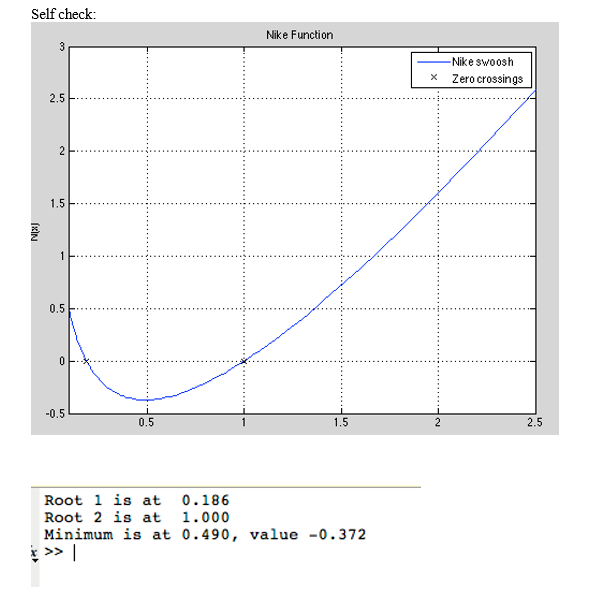 Find the roots (where N(x) is zero) of N(x) in the domain 0.1 ≤ x ≤ 2.5 using the MATLAB fzero function.