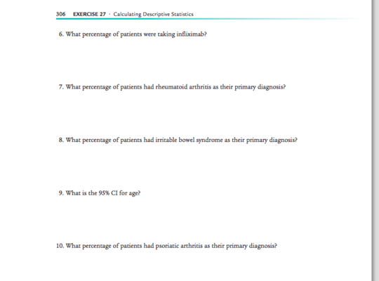 Use MS Word to complete "Questions to be Graded: Exercise 27" in Statistics for Nursing Research: A Workbook for Evidence-Based Practice. Submit your work in SPSS by copying the output and pasting into the Word document. In addition to the SPSS output, please include explanations of the results where appropriate.