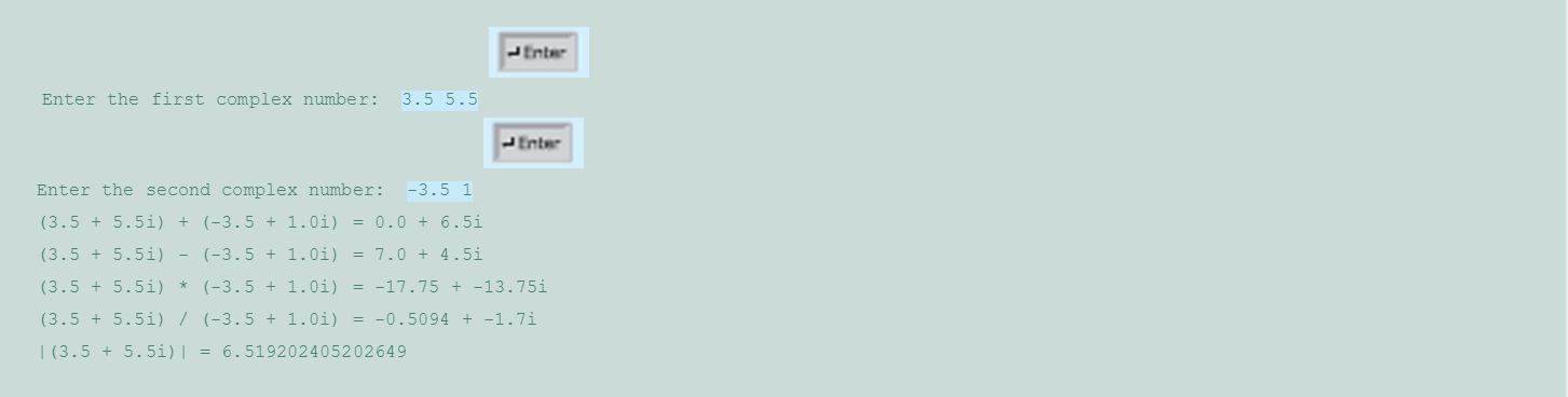 Write a test program that prompts the user to enter two complex numbers and displays the result of their addition, subtraction, multiplication, division, and absolute value.