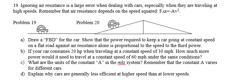 high speeds- Remember that air resistance depends on the speed squared: FAR=AV2- Problem 19 Problem 2t} % :" : a) Draw a “FED” for the car. Show that the power required to keep a car going at constant speed