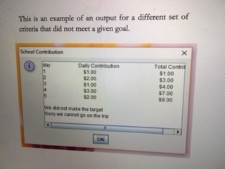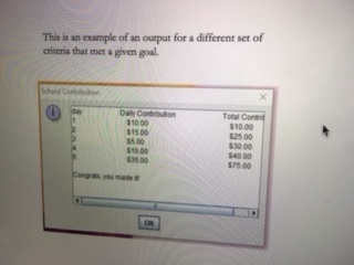 A method called toString() that returns the result.Write a test class called TestContribution that generates the daily contributions. It keeps asking for contributions until it determines that either the targeted amount of contribution is met, or the time allotted to collecting the amount of money expires. In either case it displays the amount of money collected each day, and the total amount accumulated over the period.