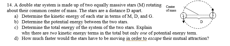 c) Determine the total energy of the system of the two stars. Explain --- _- -* why there are two kinetic energy terms in the total but only one of potential energy term-