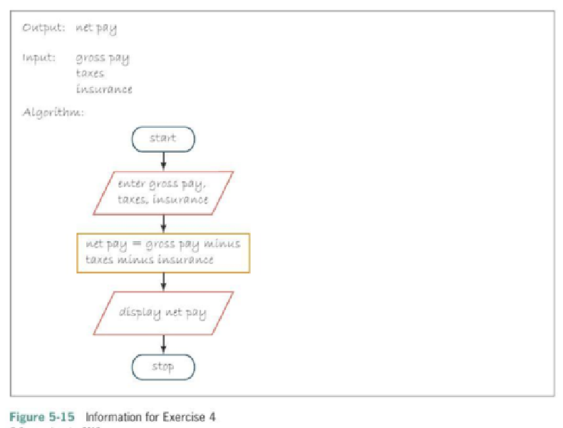 Open the Net Pay Solution (Net Pay Solution.sln) file contained in the Net Pay Solution folder. Center the net pay within it's label control. Figure 5-15 shows the problem's output, input, and algorithm. Complete the application by coding it's algorithm. Include comments in the Code Editor window. Save the solution and then start and test the application.