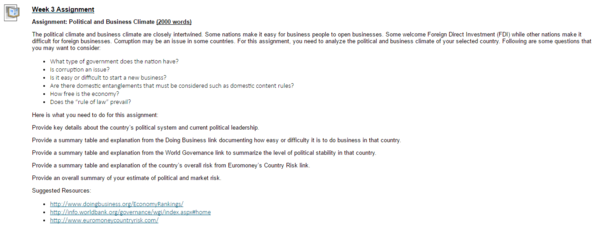 The political climate and business climate are closely intertwined. Some nations make it easy for business people to open businesses. Some welcome Foreign Direct Investment (FDI) while other nations make it difficult for foreign businesses. Corruption may be an issue in some countries. For this assignment, you need to analyze the political and business climate of your selected country. Following are some questions that you may want to consider: