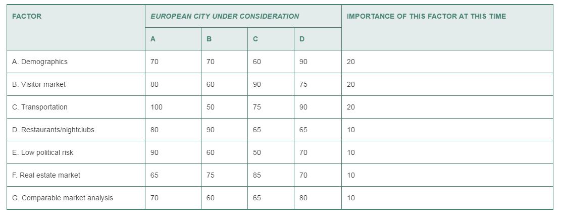 Munday is currently looking heavily into global expansion in Europe, Latin America, and Asia. “We’ve got to look at political risk, currency, and social norms—how does our brand fit into the country,” he says. Once the country is selected, Munday focuses on the region and city. His research checklist is extensive, as seen in the accompanying table.