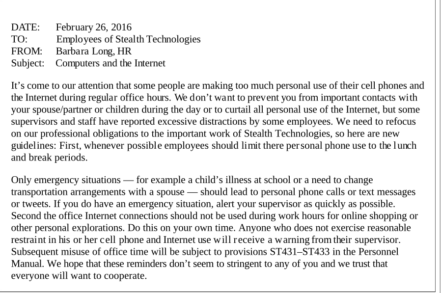 Scenario: You are one of the supervisors cited in the email, who is disturbed by excessive personal cell phone use during work hours but who is also disturbed by the poorly crafted email sent to employees. You have decided to write the email for Barbara Long to show her how a more visually attractive, concise, and persuasive email is written.