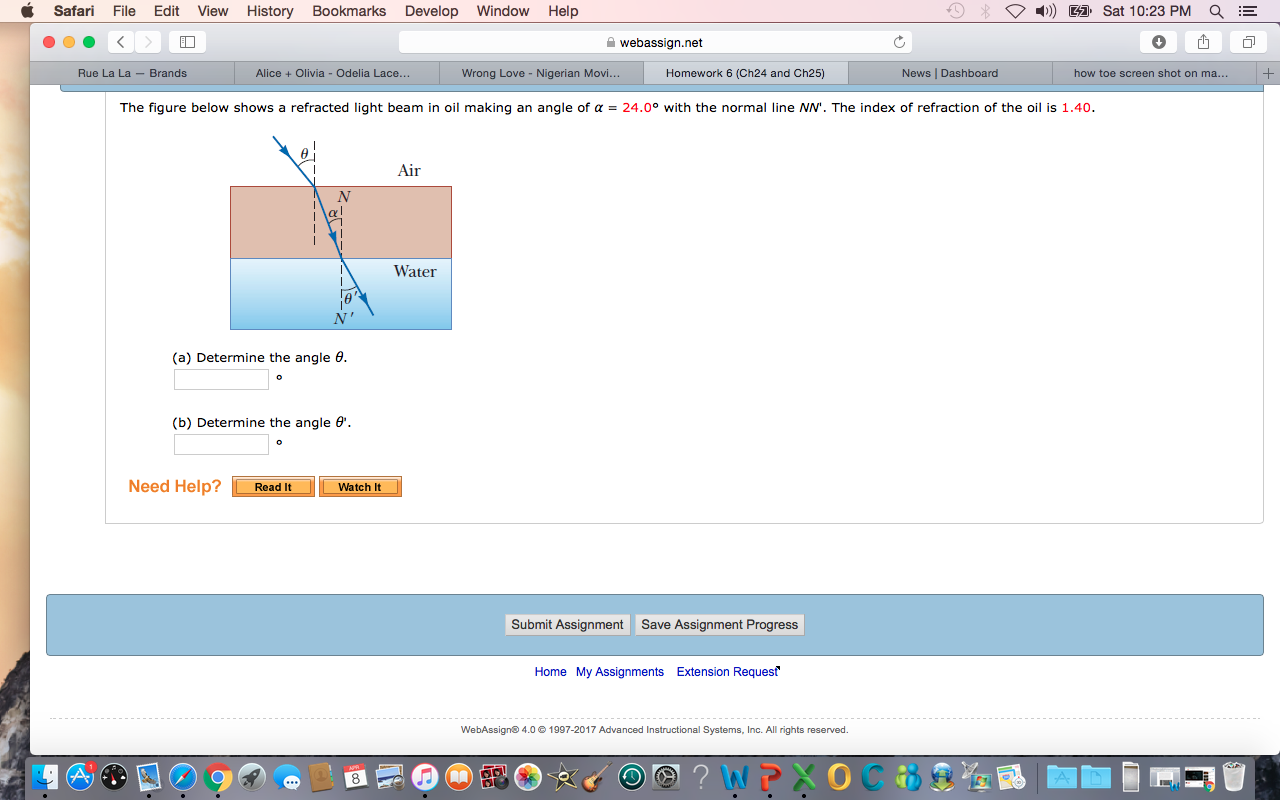 3. The figure below shows a refracted light beam in oil making an angle of α = 24.0° with the normal line NN'. The index of refraction of the oil is 1.40.