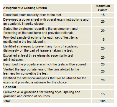For the assessment evaluation plan, begin by defining the objectives for this test. Then state the parameters against which learners will be evaluated and the weightings that each of these grading criteria will carry. In the body of the paper define the psychomotor skills that you want your learners to possess in order to complete the test successfully. In the Appendix of your paper, develop an analytic rubric for the testing purpose (use only one number/parameter [not a range of numbers] in your analytic rubric to keep it objective).