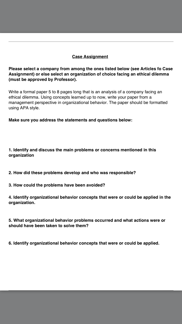 Write a formal paper 5 to 8 pages long that is an analysis of a company facing an ethical dilemma. Using concepts like leadership, motivation, managing skills, organization, etc write your paper from a management perspective in organizational behavior. The paper should be formatted using APA style. Make sure you address the statements and questions below: