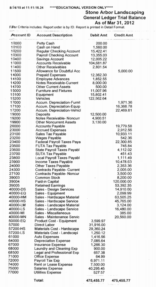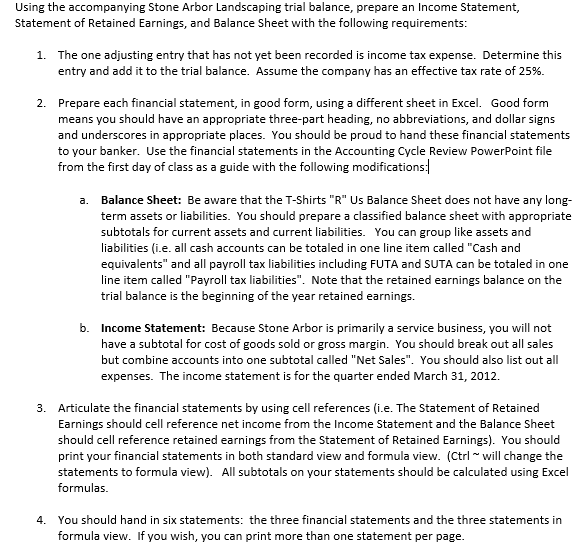 Using the accompanying Stone Arbor Landscaping trial balance, prepare an Income Statement, Statement of Retained Earnings, and Balance Sheet with the following requirements: