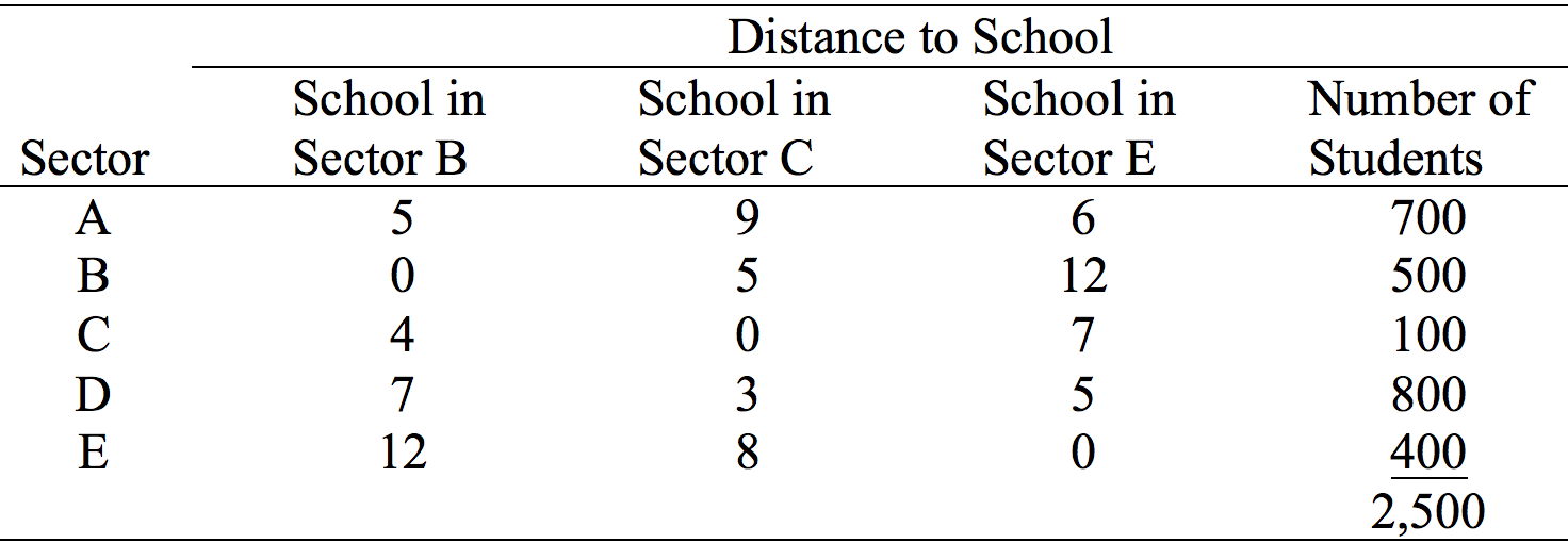 The following table reflects the number of high school-age students living in each sector and the busing distance in miles from each sector to each school(attached).