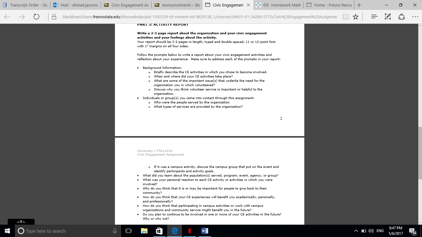 i have volunteered in Fresno rescue mission organization which helps the homeless people and what i have did is serving food for homeless. and i need to write a report about the work that i done.