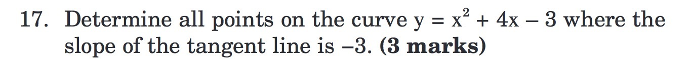 17. Determine all points on the curve y = x2 + 4x — 3 Where the slope of the tangent line is —3. (3 marks)Â