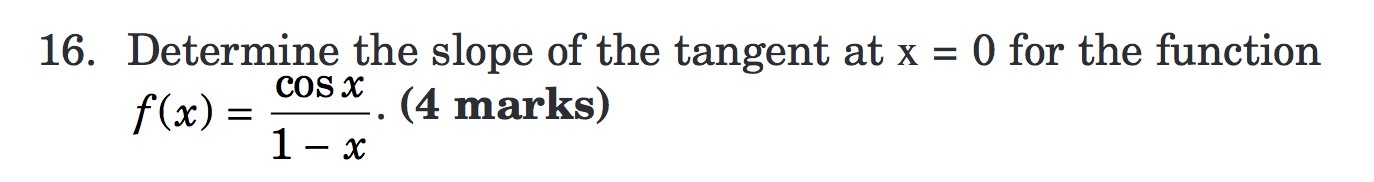 16. Determine the slope of the tangent at x = O for the function f(x) = cosx . (4 marks) 1 — xÂ