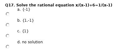 Q17.savetherafionalequafionxdeJ+6=1deJ a. {-1} r“ b. {1,-1} r“ c. {l} r“ d. no solution