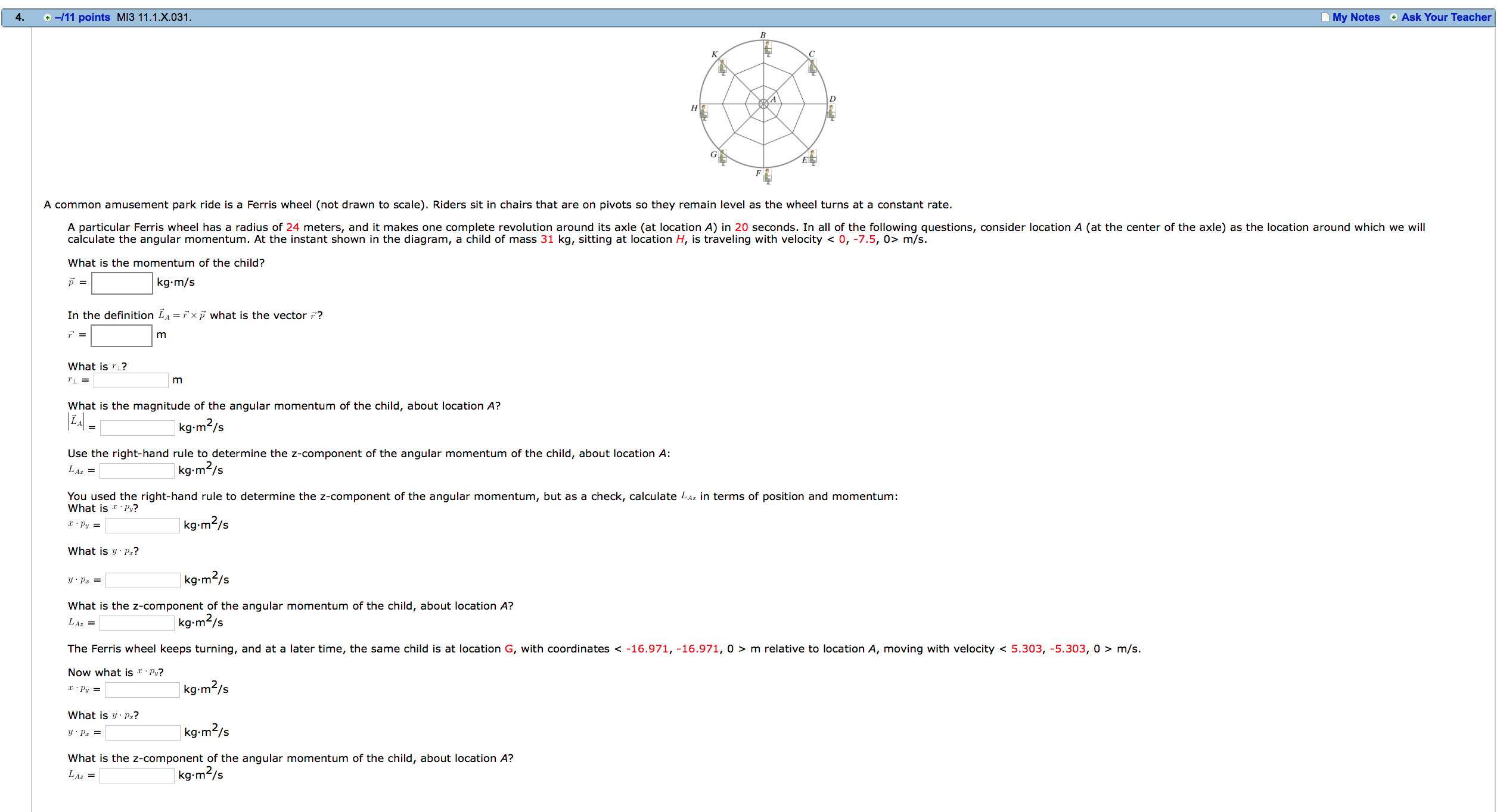 calculate the angular momentum At the Instant shown In the diagram, a chlld of mass 31 kg, sitting at location H, Is traveling wlth velocity < 0, 4.5, D> m/s. What Is the momentum of the chlld? p = kg-m/s In the definition EA =rxfi what is the vector F? r m What is u?