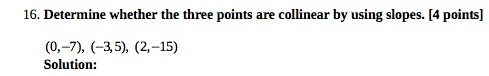 16. Determine whether the three points are collinear by using slopes. [4 points] (0, —7), (—3, 5), (2, —15) Solution:Â