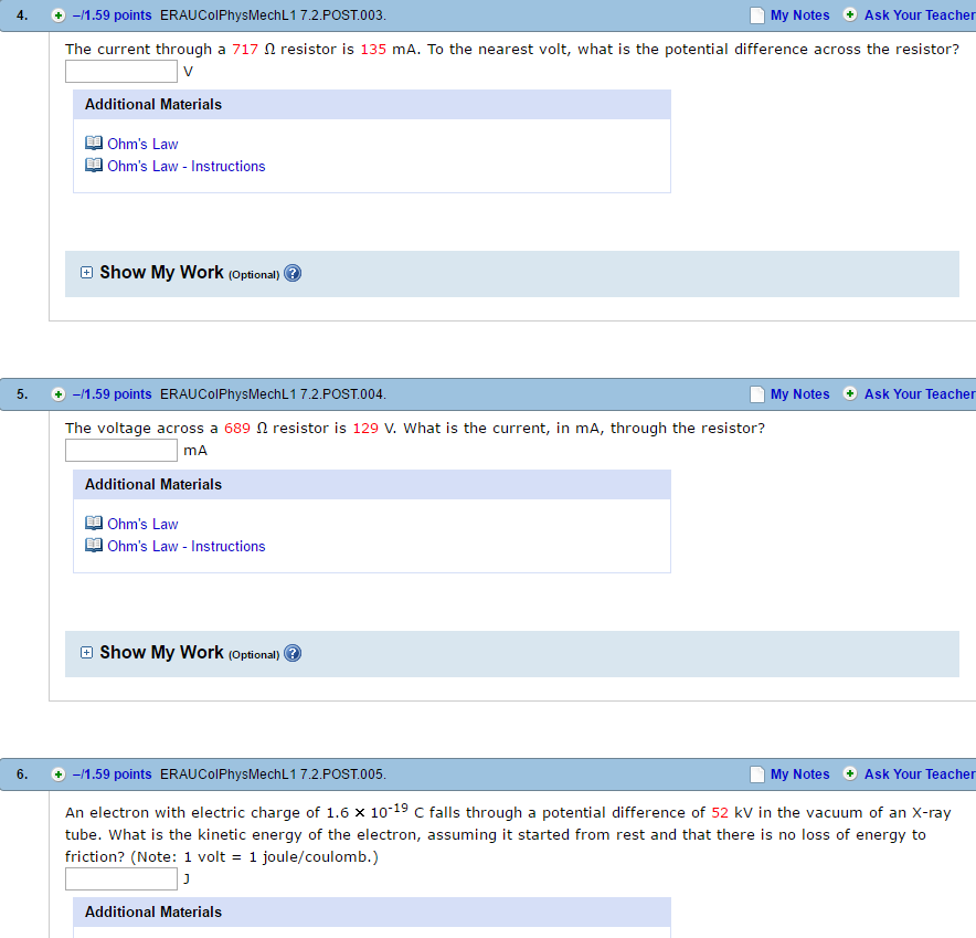 a Ohm's Law - Instructions An electron with electric charge of 1.6 x 10'19 (3 falls through a potential difference of 52 Mi in the vacuum of an X-Iav