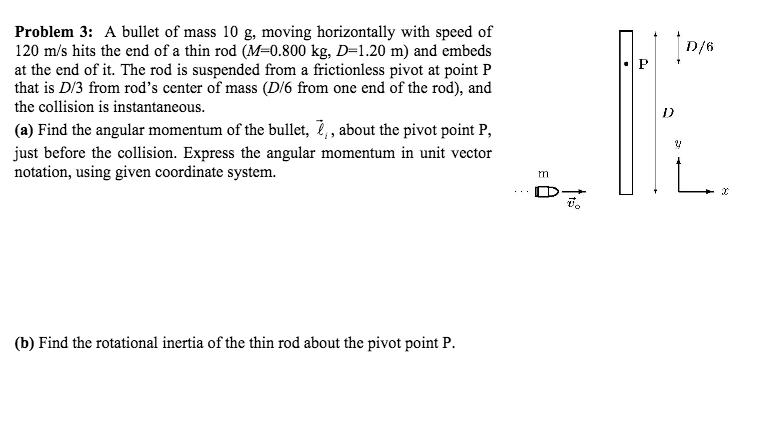 the collision is instantaneous. {a} Find the angular momentum of the bullet, l!"a , about the pivot point P, just before the collision. Express the angular momentum in unit vector